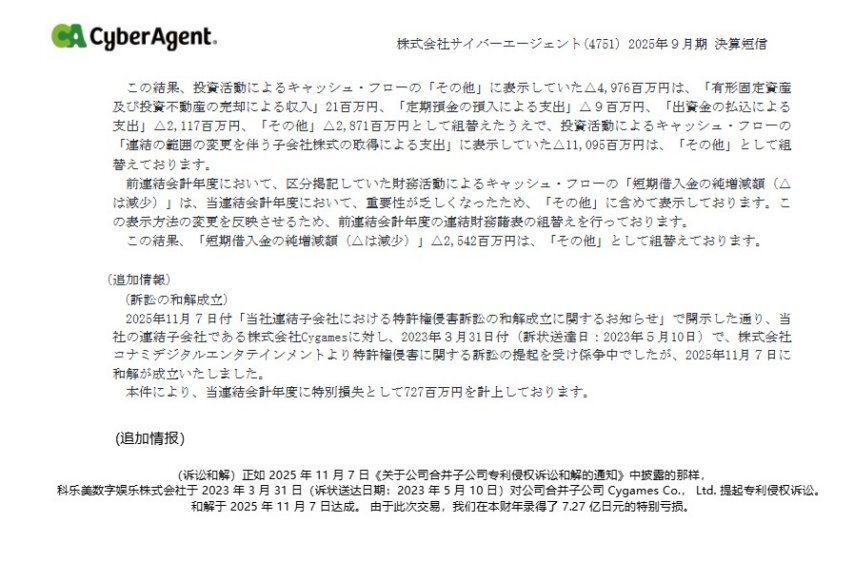 《赛马娘》的开发商Cygames,其母公司CyberAgent于近日发布消息称,此前与科乐美围绕《赛马娘》产生的专利纠纷,目前双方已达成诉讼和解;而这一和解事宜将在本财年为公司带来7.27亿日元的特别损失。