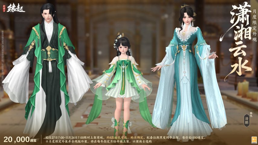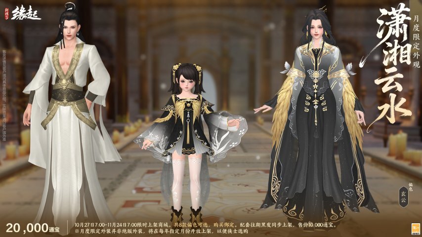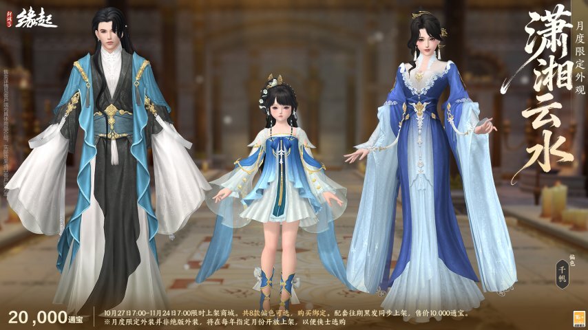云气生于潇湘之上,碧水浩渺接天际,衣袂轻盈翻飞如流动的烟霞。本月限定外装「潇湘云水」乘云而来。外装新增千帆、清鹏两款偏色,尽显雅致风韵,成男、成女、萝莉款式各有独特韵味,巧妙融合山水灵秀与服饰之美。