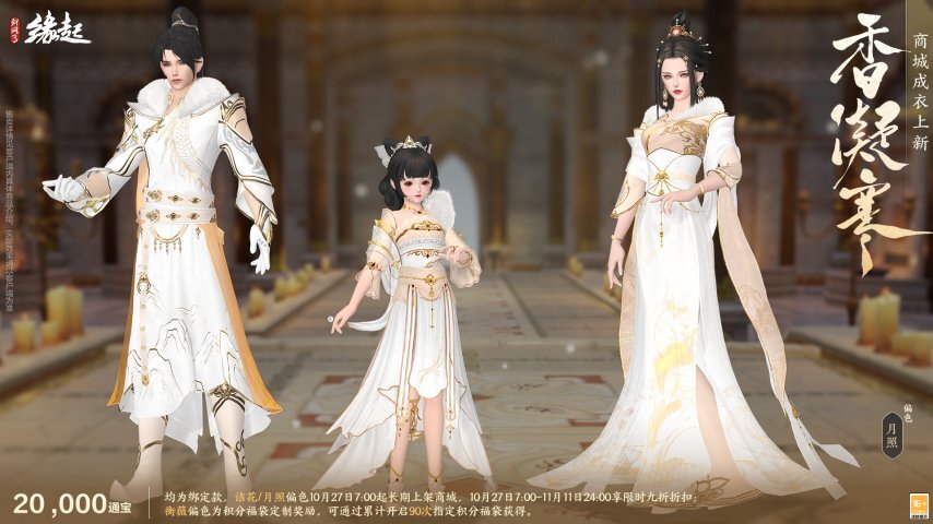 均为绑定款,诘花/月照偏色将于10月27日7:00起长期在成衣商城上架,10月27日7:00至11月11日24:00期间可享受限时九折优惠,折扣后价格为18,000通宝。