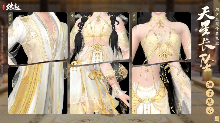 成女款轻纱覆体,袖摆灵动,行走间月光流转。上身设计精巧,大胆露出纤纤素腰,冰肌玉骨。裙身素白为主,腰间金色环佩叮当碰撞,摇曳生姿。