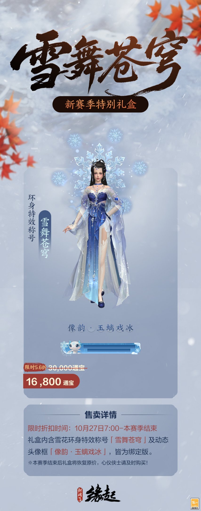 礼盒包含环身特效世界称号「雪舞苍穹」及动态头像「像韵·玉螭戏冰」,享限时5.6折 ,折后16,800通宝。