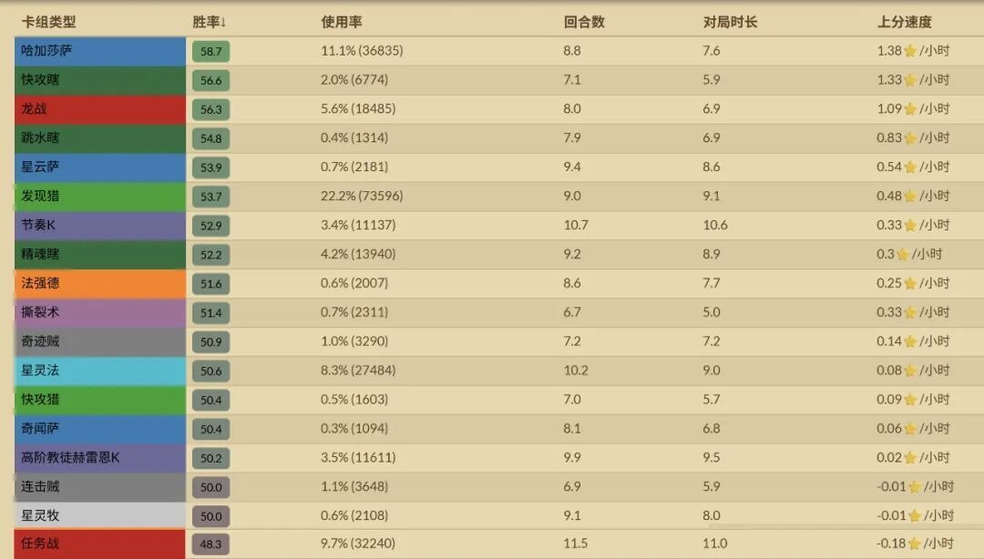 在传说分段中,中速萨的出场率为11.1%,发现猎为22.2%,任务战为9.7%,龙战为5.6%,星灵法为8.3%;这五个卡组的出场率总和接近60%。