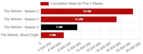根据网飞官方公布的数据,《猎魔人》第四季上线首周的观看量比第三季的1520万次大幅下降了52%,甚至还不到第二季首周1850万次成绩的一半。这样的表现仅仅比口碑崩盘的衍生作品《猎魔人:血源》(460万次)略好一些,与该系列曾经的巅峰水准相去甚远。