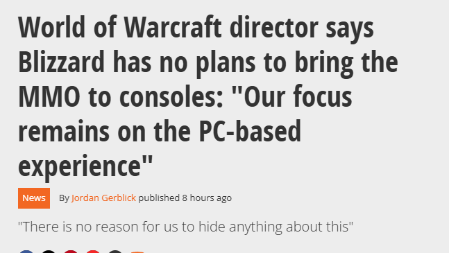 他坦言:“说实在的,我们没什么可隐瞒的,当下的核心还是放在PC端的游戏体验上。要是我们真在推进《魔兽世界》往主机或其他平台移植的事,肯定会明确说明‘我们正在全力投入,虽然还有不少工作要做,但这是我们努力的方向’。”