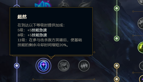 第三列选择【超然】,是由于莫甘娜的Q技能与E技能均为对线期的强势技能,不过前中期技能冷却时间过长,需要借助减CD效果才能更顺畅地进行对线。