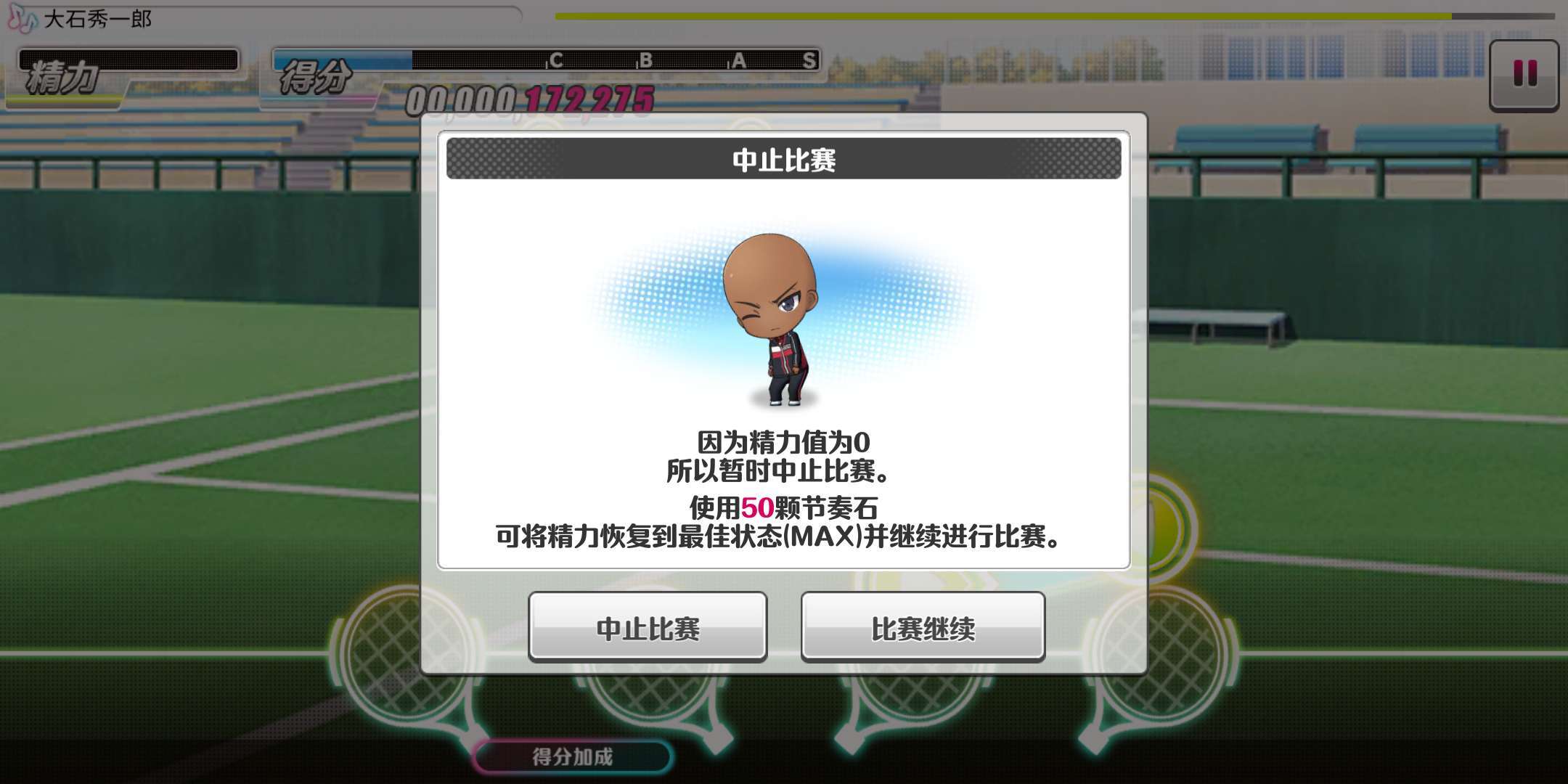 想要通过15星难度的曲目,维持连击状态至关重要。这是因为一旦断连击的次数过于频繁,玩家在这场比赛中的精力就会消耗殆尽,而精力耗尽时会直接跳出是否终止比赛的界面,要是玩家不花费节奏石,就没办法继续进行比赛了。