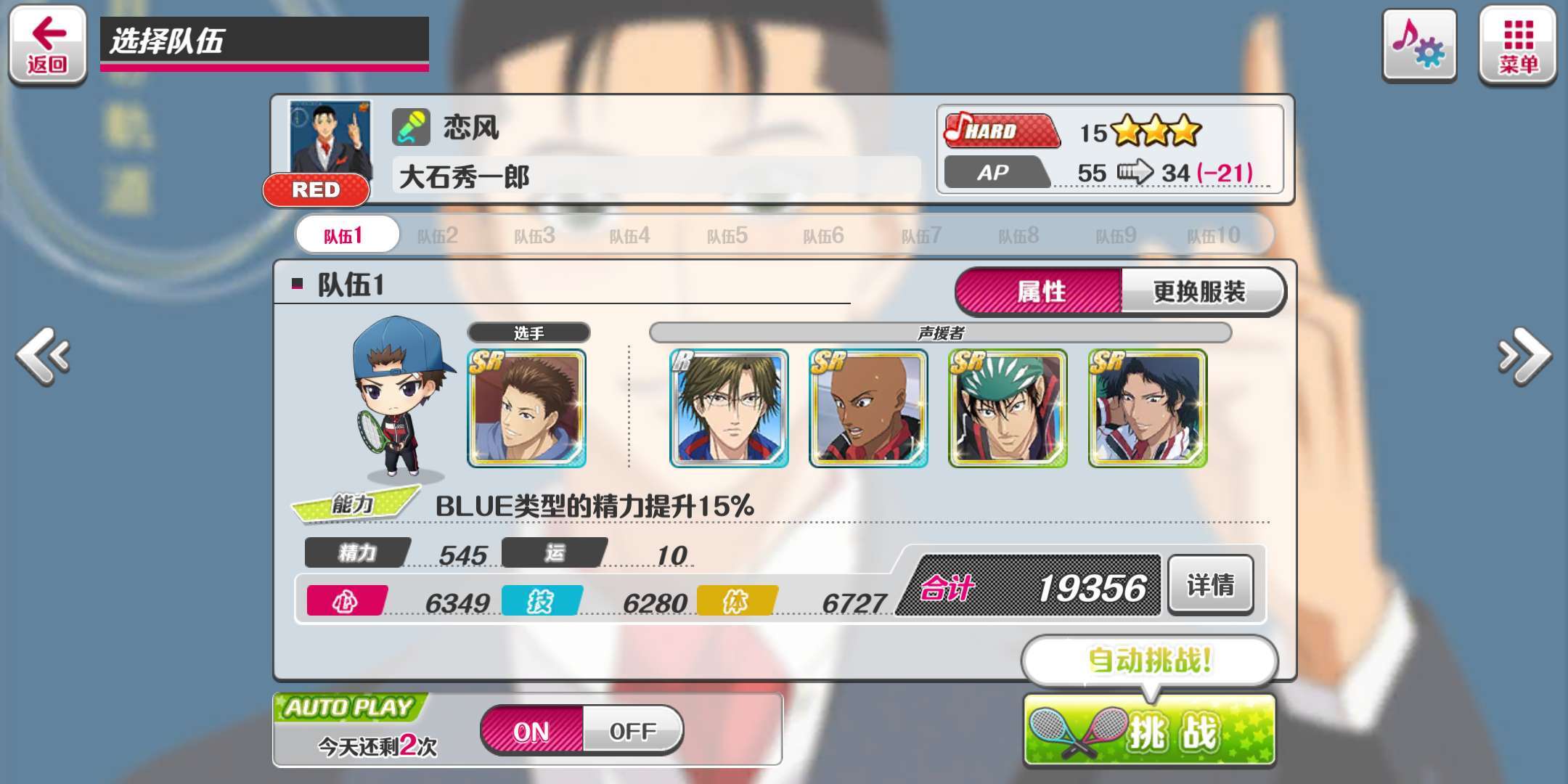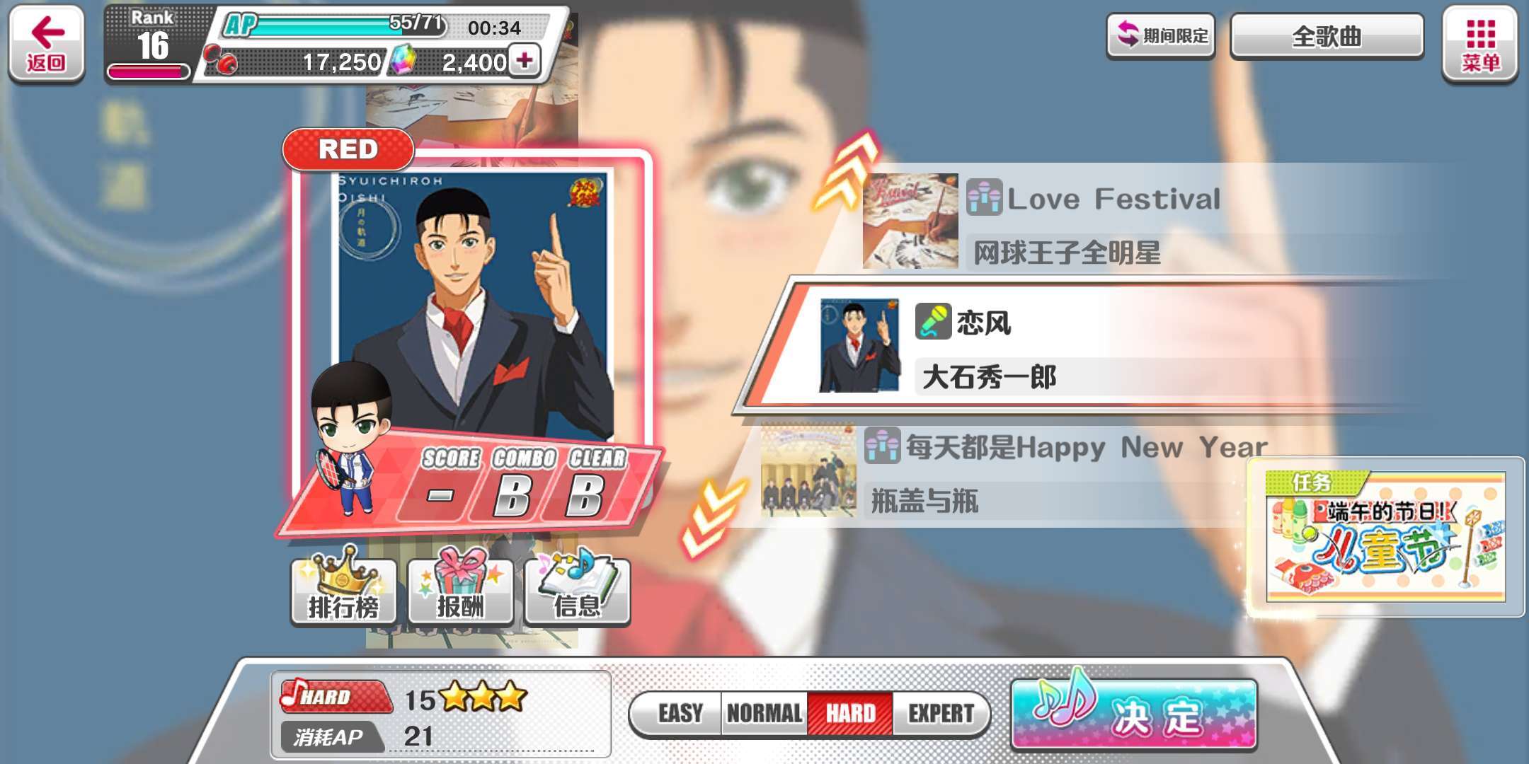 首先,挑选一首歌曲,在页面底部选择第三个难度“HARD”,这便是15星的难度。选好后点击右下角的“决定”按钮,即可进入队伍选择界面。