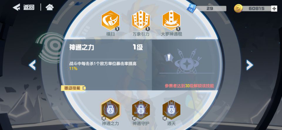 中间的被动技能更偏向防御属性,能降低敌方造成的物理伤害,这有助于提升我们的续航能力——毕竟在战斗中,先保证生存才是核心关键。最后搭配一个提升伤害的技能,它对生命值较低的单位能造成更高伤害,这确实符合“第一”应有的输出水准。