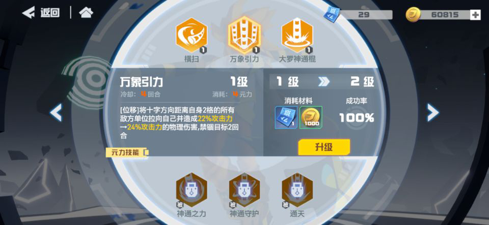 第一名的技能确实值得深入钻研,开局就亮点十足。他的一技能“横扫”能显著强化普攻,让普攻变成群体伤害,一次可攻击范围内的四名敌方单位,清小怪的效率因此提升不少。至于二技能“万象天引”,机制上和金的技能有些相似,都是十字范围攻击,不过额外附带了让目标紧固两回合的效果。