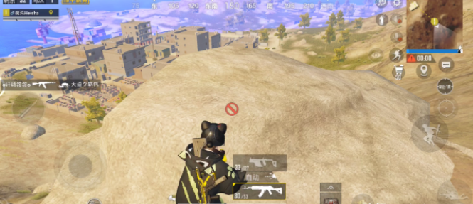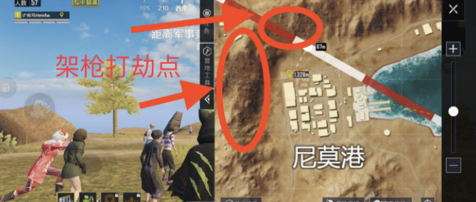 尼莫港西北方向的山坡上有个架枪点,这里视野开阔,位置居高临下,还有石块可以当作掩体,用一个三倍镜就能轻松掌控这个点位。快速捡完金条并成功从尼莫港突围后,就能来到这个位置,因为毒圈大多会往西北方向收缩,所以从尼莫港出来的人都能看得一清二楚。