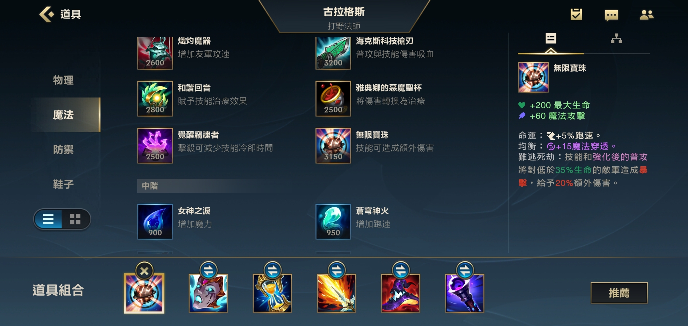 这第一件装备我们选择无限宝珠,出了它之后酒桶的爆发伤害会变得很高。无限宝珠的属性相当出色,能提供固定的法术穿透与法强加成,并且能对生命值低于30%的敌人造成额外20%伤害,以此提升酒桶的斩杀线。