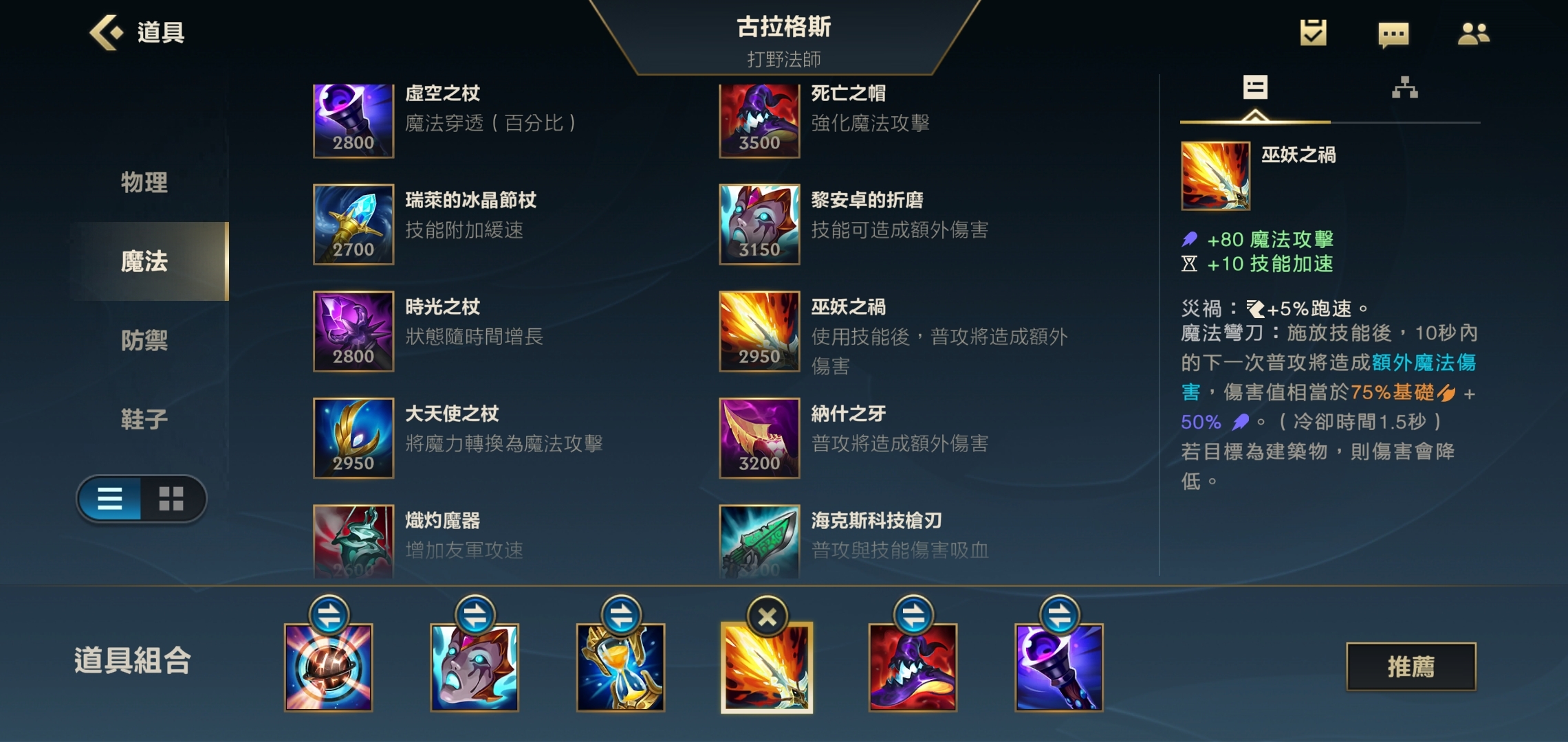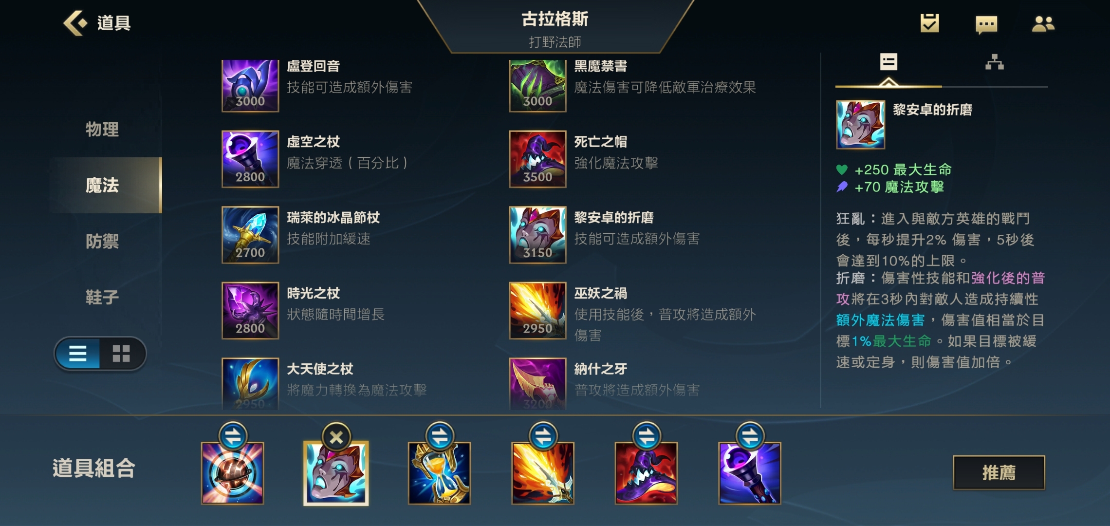 第五件和第六件装备我们选择帽子与法穿棒。帽子能提升法术强度,从而增强酒桶的伤害;法穿棒则可增加酒桶的百分比法术穿透,进一步提升其爆发能力。