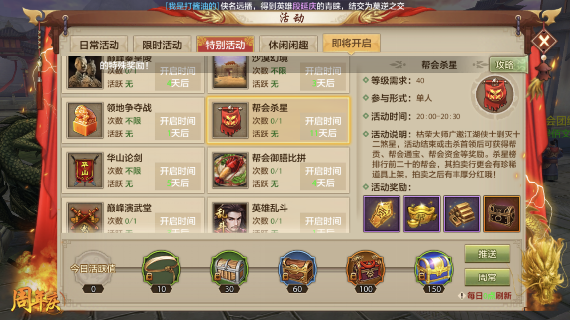 帮会杀星活动的参与条件较为特殊,仅在每天20点至20点30分这半小时内开放,而且活动间隔的日期比较长。若想了解下次帮会杀星活动还有多久开启,我们可以通过活动界面中的“即将开始活动”页面来查看具体的天数。