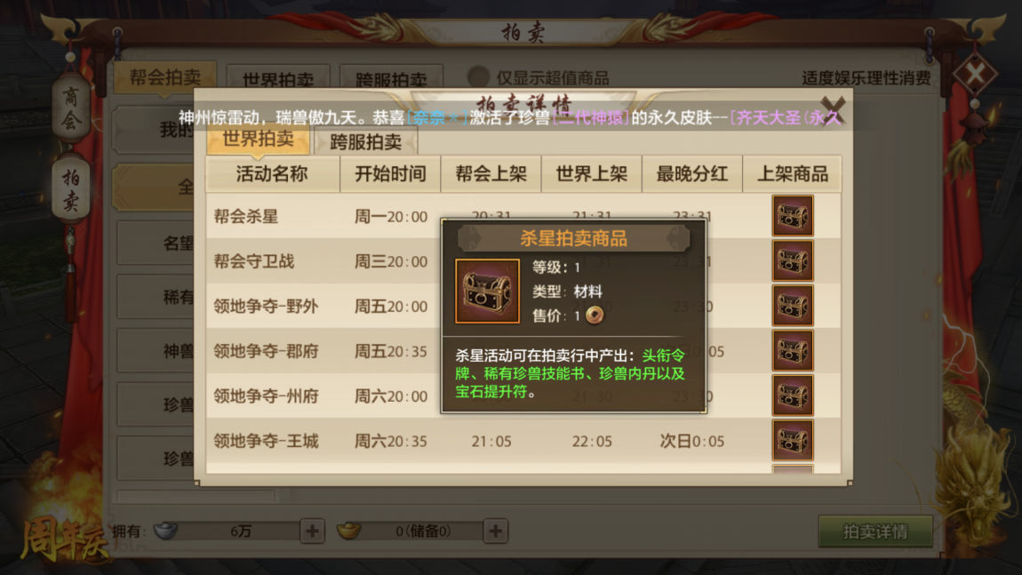每周一晚上8点会开启杀星活动,帮会拍卖的物品会在20:31时上架到帮会拍卖界面。帮会成员能够使用优先权限参与竞拍,到21:31这些物品就会转到世界拍卖上架,这时所有玩家都可以对物品进行竞价。参与活动的帮会成员最晚在23:31会收到分红,分红会发送到他们的邮箱里;不过要是物品在世界拍卖中没人出价,系统就会把它折价收回。