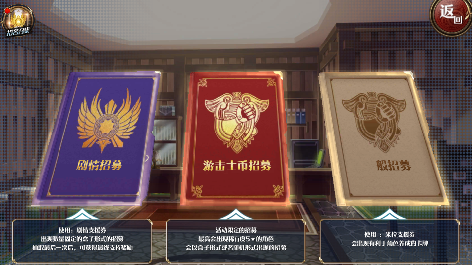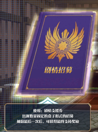 (1)「剧情招募介绍信」:使用「剧情招募介绍信」出现数量固定的盒子形式的招募,抽取最后一次后,可获得最终支持奖励。