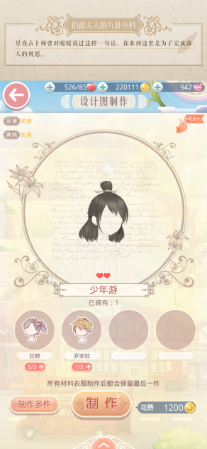 1、发型少年游——其中包含了能在3-11公主级关卡获取的狂野,以及可在服装店购买得到的罗密欧,点击制作按钮,就能获得少年游这款发型。