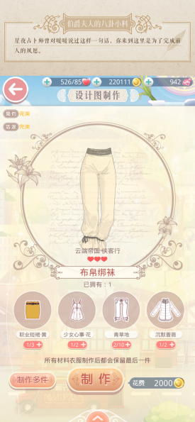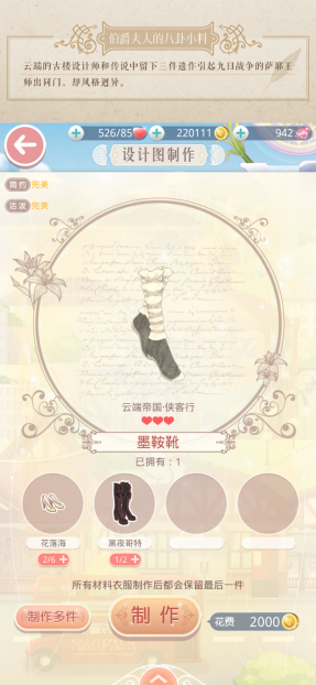 4、鞋子墨鞍靴——这个制作步骤稍显繁琐,需要先制作衣服类的组件,比如哥特鞋子就需要用到多种不同的衣服来合成,这些所需的衣服都能通过服装店购买或者挑战少女级关卡获取;等哥特鞋子做好后,再着手制作侠客鞋子,而“花落还”(应为“花落海”)的材料也可以去之前的少女级关卡中获取。