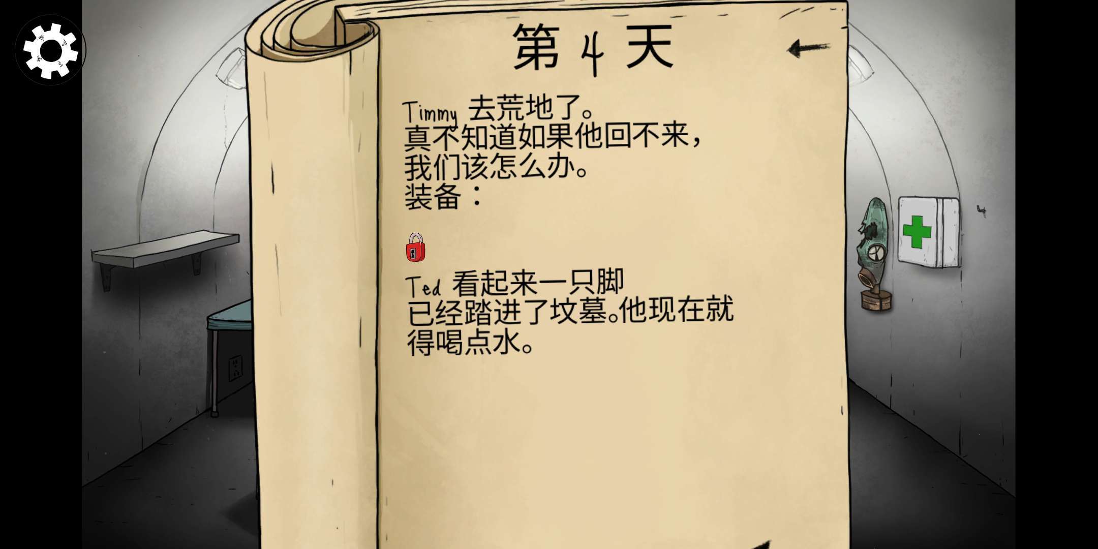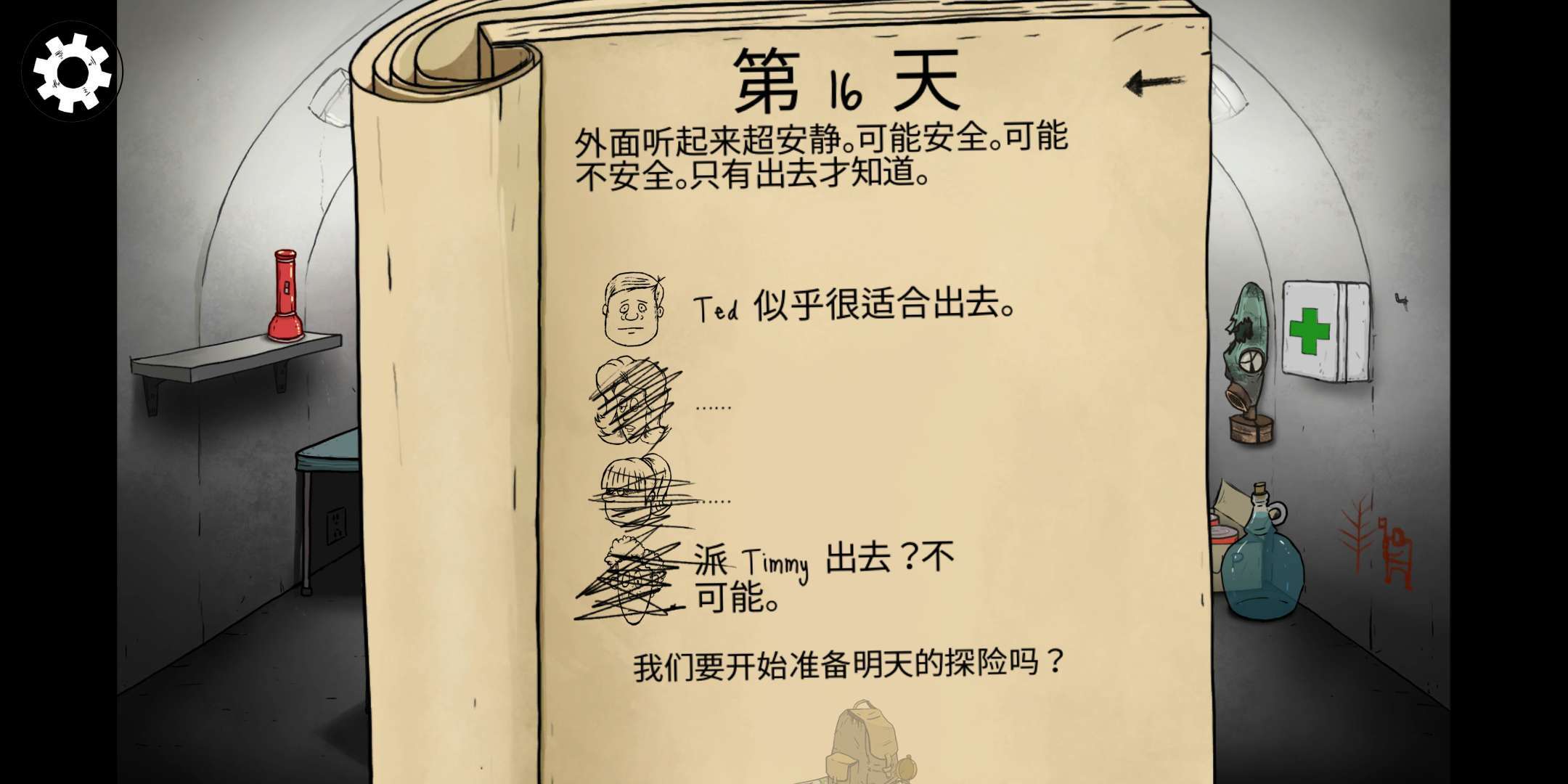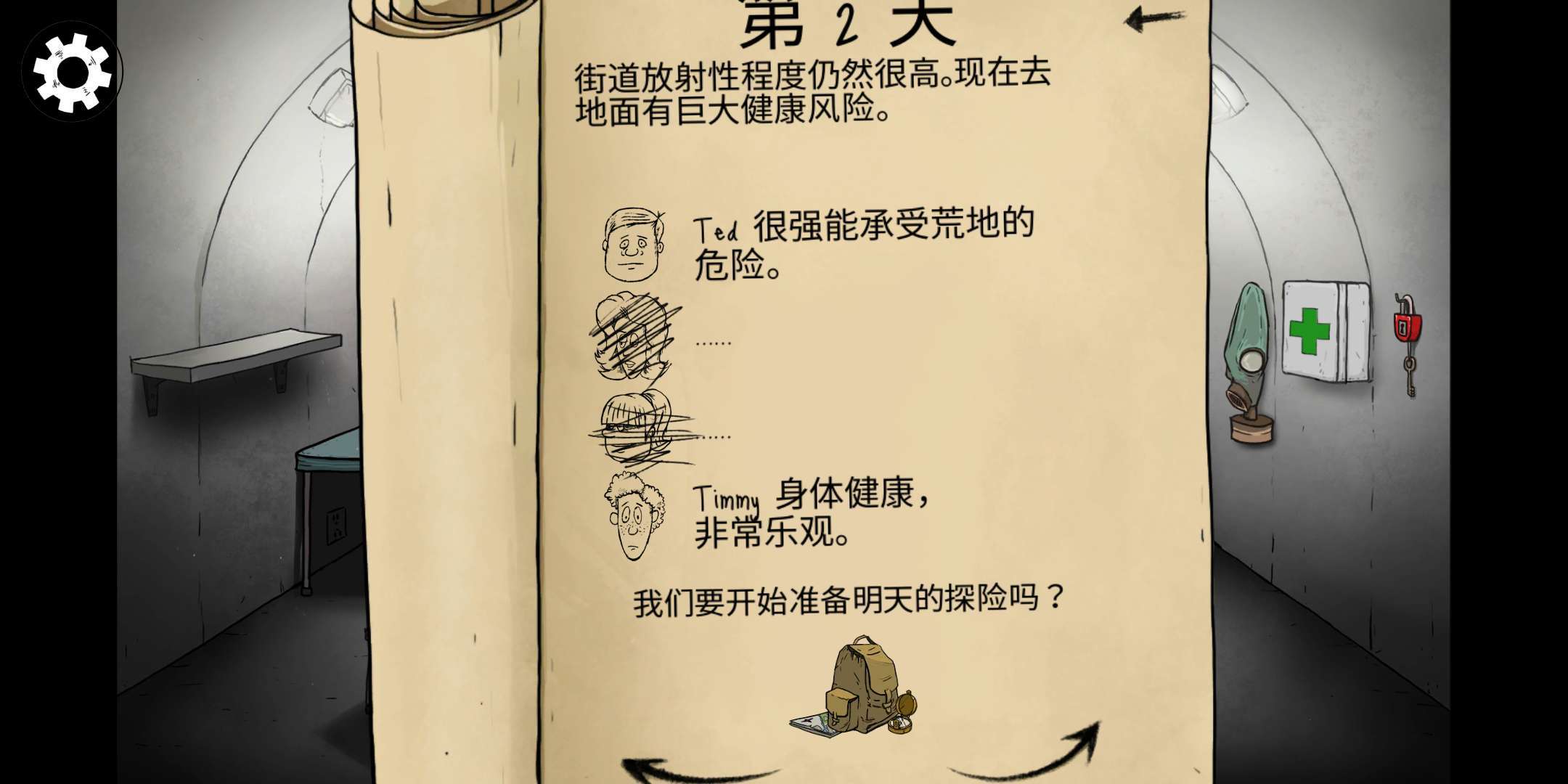 这次我开局选的是泰德和他儿子,第二天就安排儿子外出搜集物资。要是玩家手头有挂锁和子弹,建议让出去探险的角色带上,说不定能用来交换其他有用的道具。尽量别让泰德出去冒险,毕竟他要是在外面遭遇不测,游戏会因为避难所里没有成年人直接结束。后续可能会有其他成员生病后返回避难所。