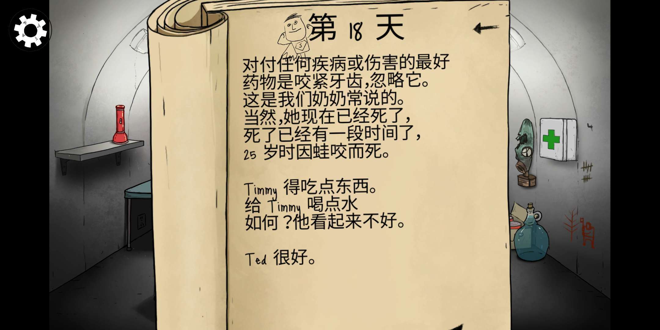 儿子在探险后躲进避难所时,往往会出现受伤的情况,这种受伤有一定概率会引发疾病。不过我通常都选择不进行任何处理,主要是因为物资确实太匮乏了。