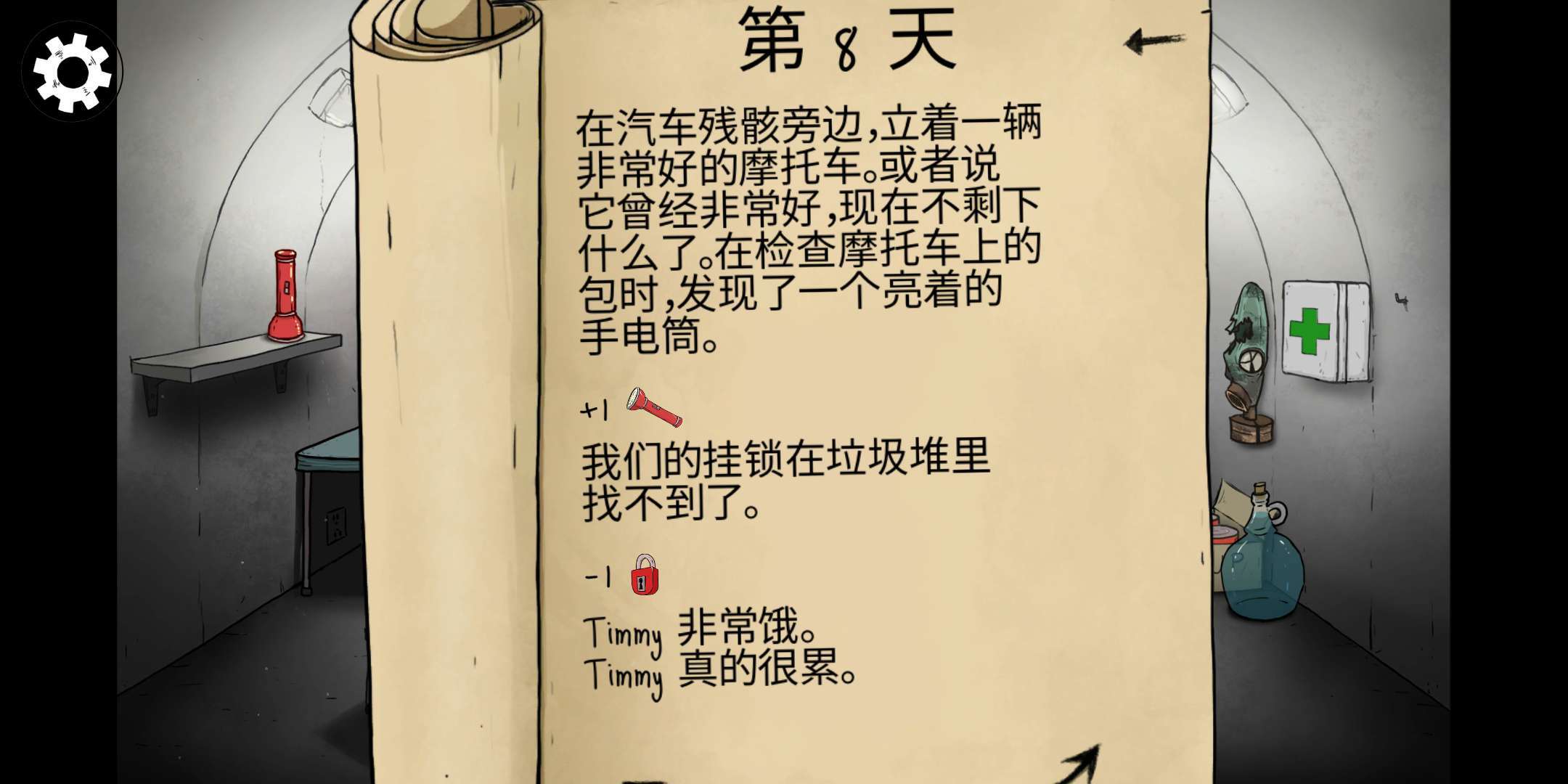 要是玩家在沙皇炸弹难度下抽到的角色是儿子,那游戏难度会稍微降低一点。儿子外出搜集物资时,大概率能给玩家带回额外的道具,玩家可以把不太重要的道具带出去探险。这次带回来的手电筒正好在第二天遇到狗狗剧情时派上了用场。