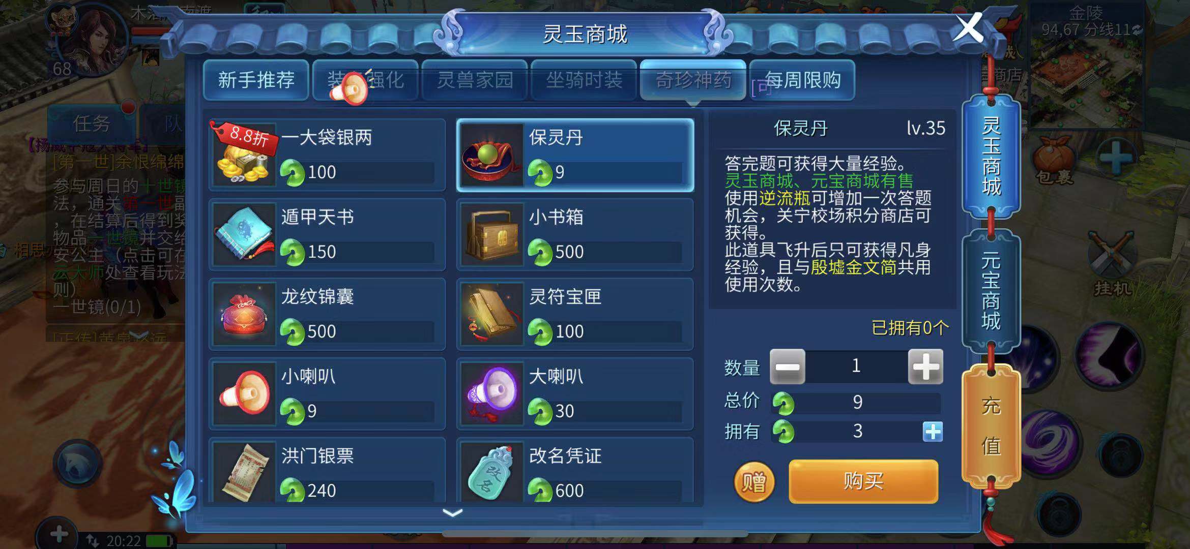 玩家也能在易市与商场中购买经验丹书和保灵丹,这两种道具都能让玩家获得大量经验,从而帮助玩家更快升级。其中,经验丹书每日最多可使用四本,而保灵丹则是玩家通过答题来获取经验值的道具。
