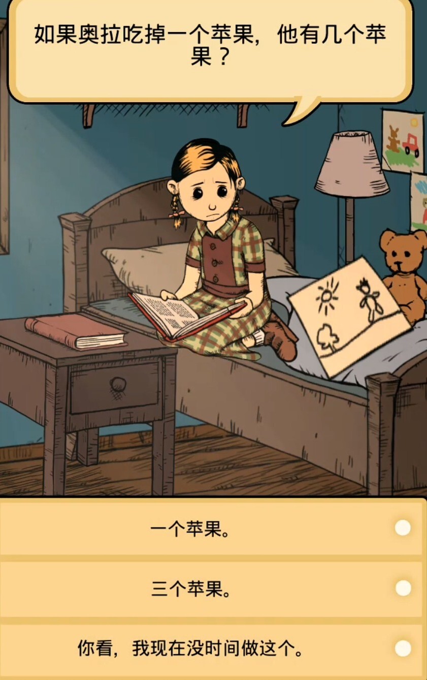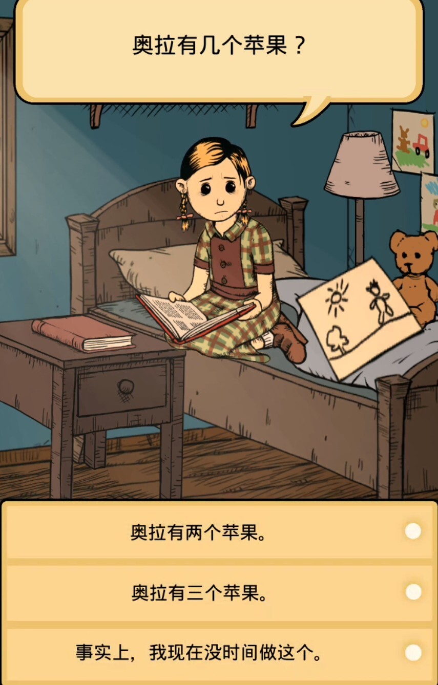 在孩子提出的第一个问题中,林恩和奥拉原本各自有一个苹果。当林恩把自己的苹果给了奥拉之后,奥拉总共会有几个苹果呢?这个问题其实就是简单的加减法运算,不存在脑筋急转弯之类的隐藏陷阱,玩家直接回答“两个”就可以了。