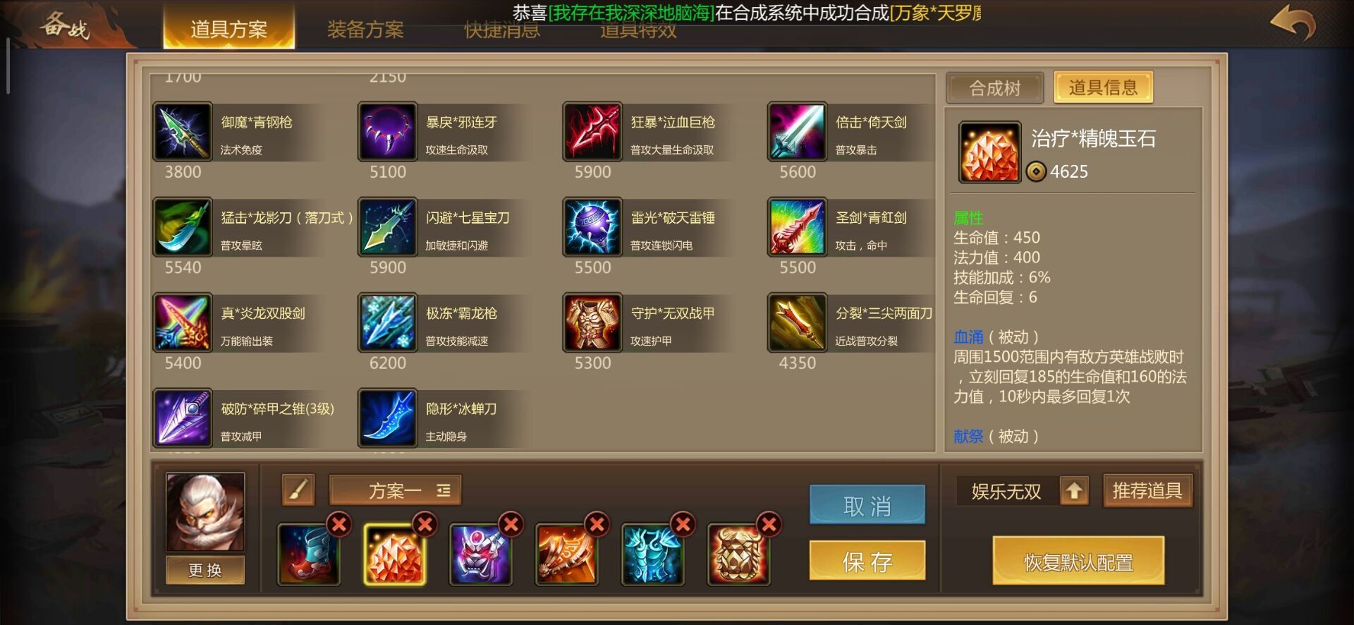 在完成帷幄靴这件装备后,建议玩家着手搭配肉装,第二件装备可考虑选择精魄玉石。这件装备能为黄盖增加生命值、法力值以及生命恢复速度,对于提升黄盖在线上的消耗能力很有帮助,让他更能扛伤害,也不用频繁回城补充状态。此外,当黄盖周围有敌方英雄被击败时,他还能获得一定量的生命值和法力值回复,这一效果相当实用。