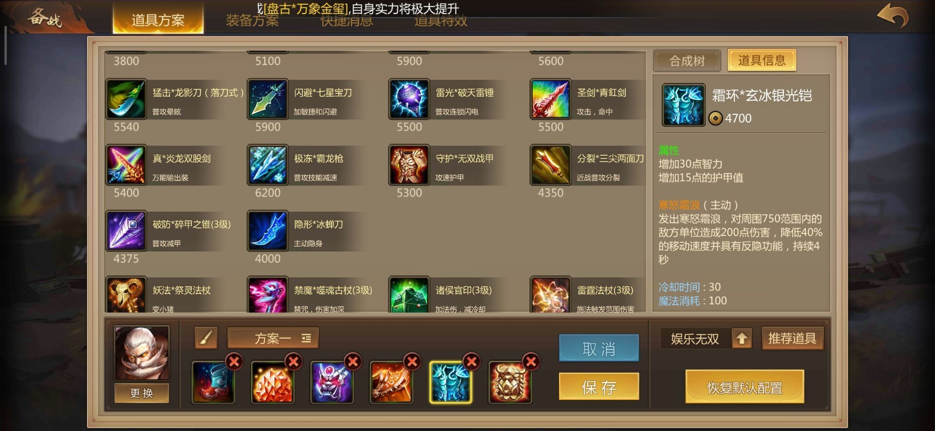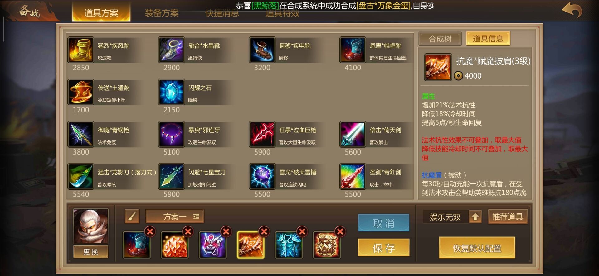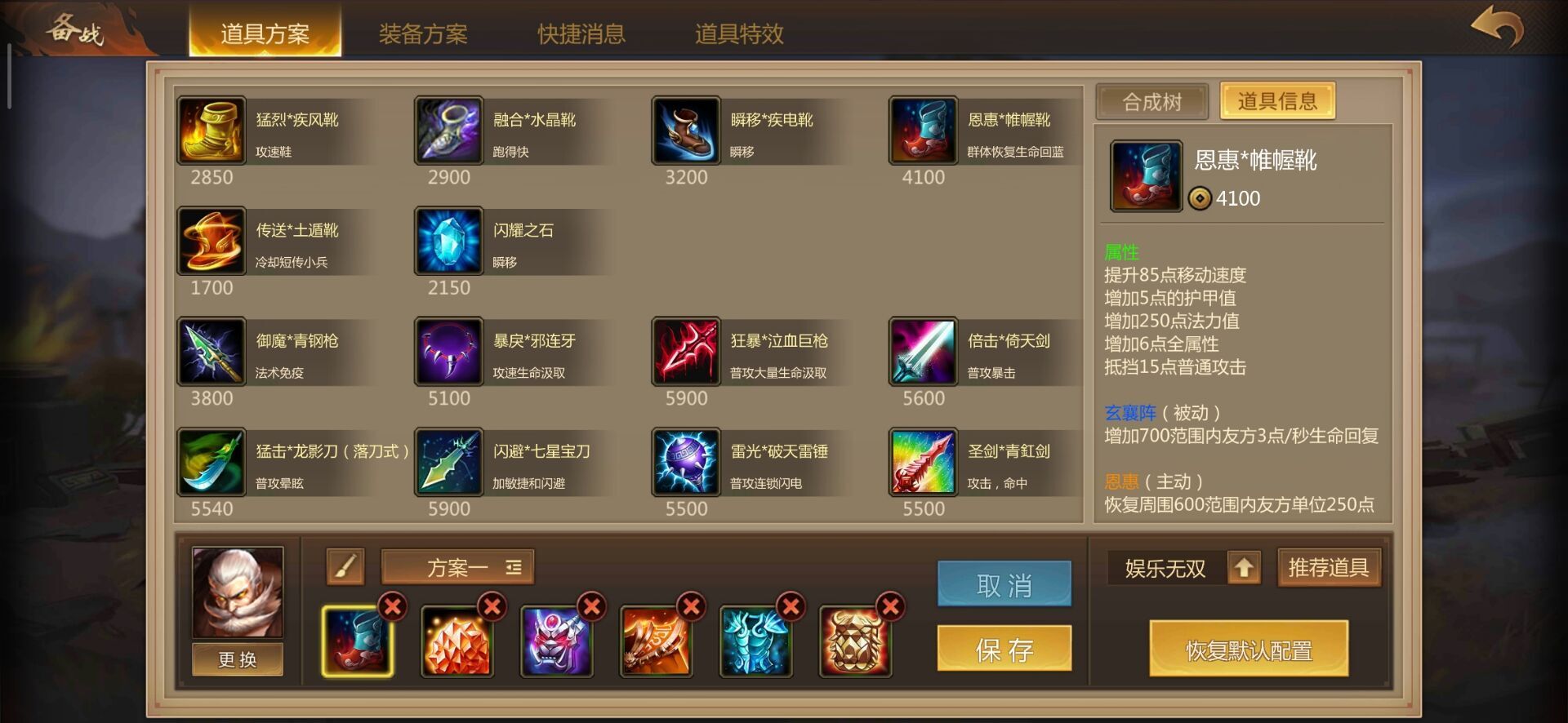 这是件性价比超高的装备,前期能给黄盖提供大量移速、护甲、法力值和属性加成,甚至带有主动回血技能,危急关头可以奶活自己和身边的队友。