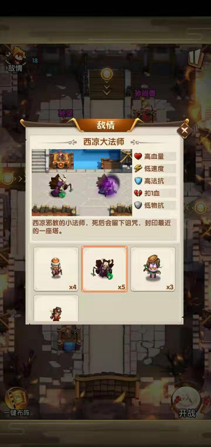 敌方的西凉大法师在被击败后,会释放出一种封印,使得武将无法参与下一轮作战。这种情况下,就需要将法师或炮手安排在前排,这两类武将都能借助防御塔来触发技能,以此降低敌人的移动速度,从而为其他武将攻击敌人争取到一段有利的时间。
