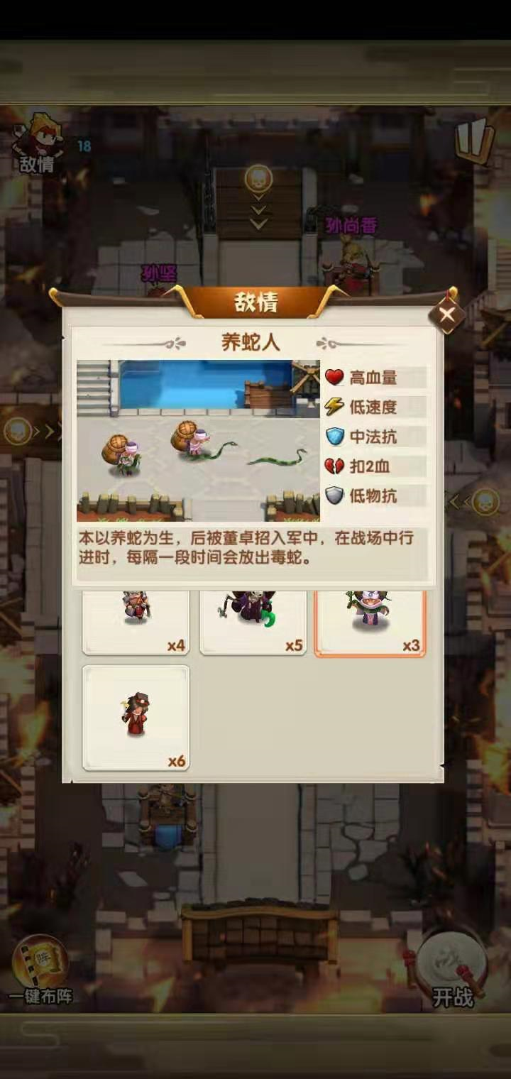 当敌人发动进攻时,先锋会率先展开攻击。在排兵布阵时,玩家需要先充分掌握敌人的信息,例如敌方的养蛇人,当我方武将攻击到她时,她会放出蛇;这些蛇移动速度很快,会迅速脱离武将的攻击范围,转而攻击主公。