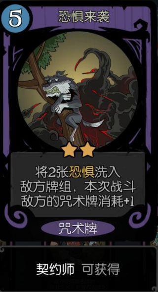 惧怕的特效是往敌方牌库里洗入”惧怕”卡片,惧怕卡片能够视为法力版的“缓慢”(运用1行动力抽一张卡),显得好像平平无奇,但由于上文提及的“吸取”机制,就算是法师类的对手在咱们契约师眼前同样是并不是有蓝的,因此惧怕每每能具有相似洗入“谩骂牌”的沾污牌库特效,因为妖怪的牌库通常卡数都偏少,因此这张沾污特效就越发出彩。