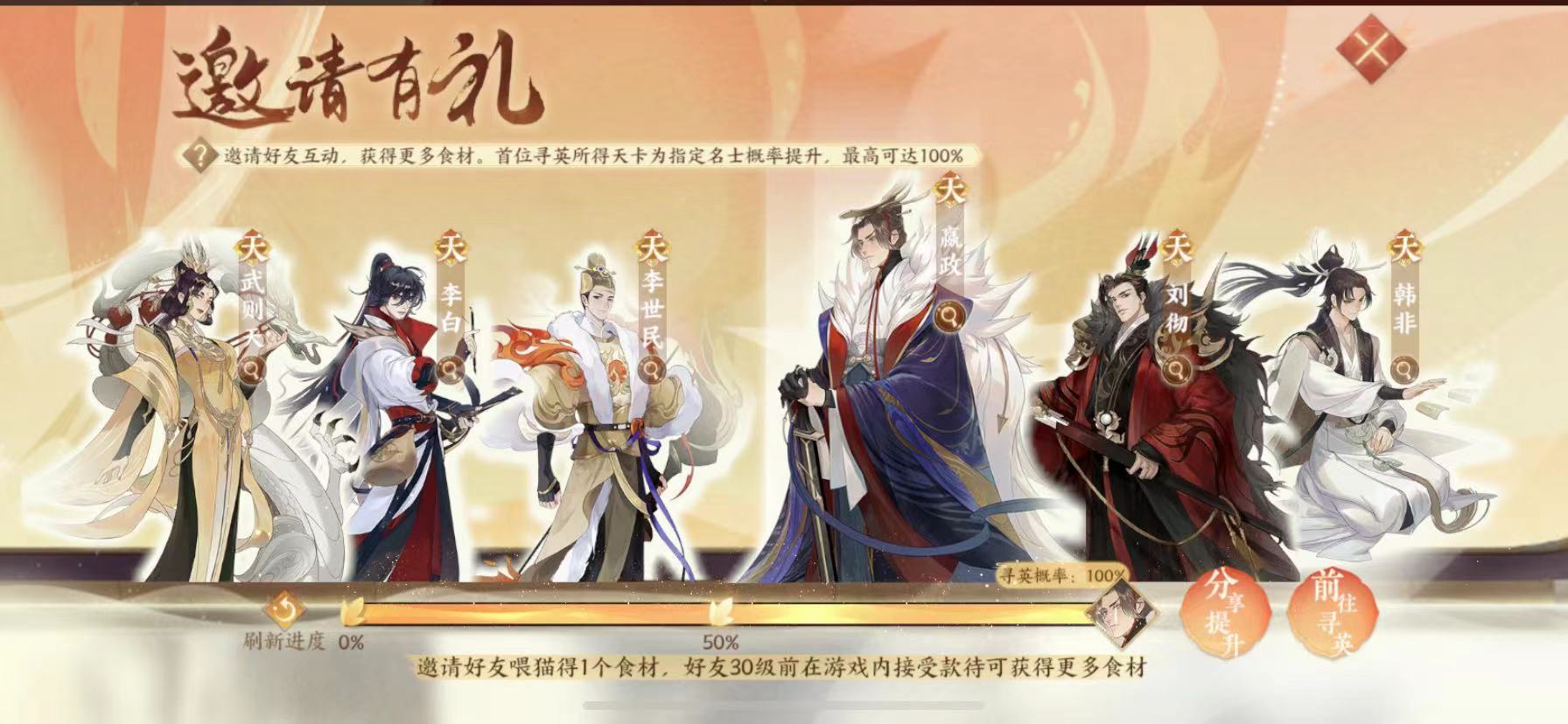 玩家初次进入游戏时,游戏内会开启新手专属卡池。该卡池的核心福利是:首次抽取即可100%获得一张天卡,可选范围锁定在嬴政、武则天、李白、李世民、刘彻、韩非六位角色中。以小编为例,当时选择的是李世民角色,选定后点击界面的“前往寻英”按钮即可确认选择。此外,玩家在这个新手卡池累计抽取满30次,还能再次100%获取李世民这张卡。