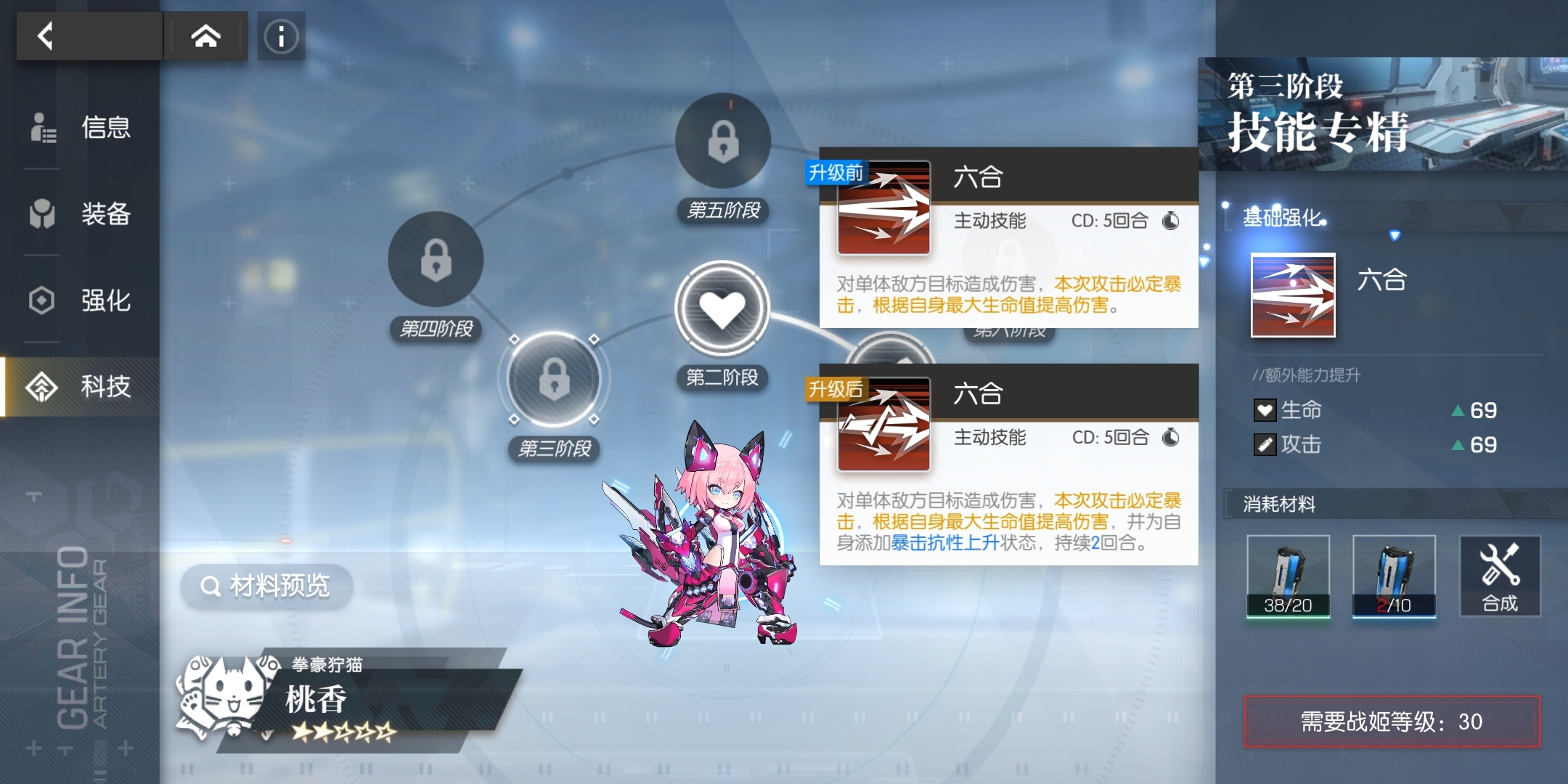 科技系统包含六个阶段,战姬等级每提升10级就能解锁一个阶段,玩家可以消耗不同品质的密钥来进行科技研发。其中第一、二、四、五阶段会各自提升战姬的基础属性,第三和第六阶段则会分别增强战姬的主动技能,例如桃香的六合技能在强化之后,会获得暴击抗性提高的效果。