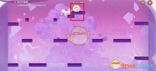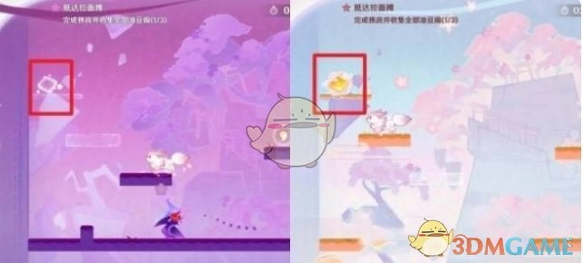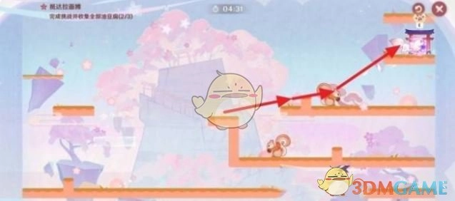 4、先切换至噩梦状态,接着跳到上方的平台。随后向左上方跳跃,在跳跃过程中,同步切换为美梦状态,连续跳跃两层后,拾取左上方的油豆腐。
