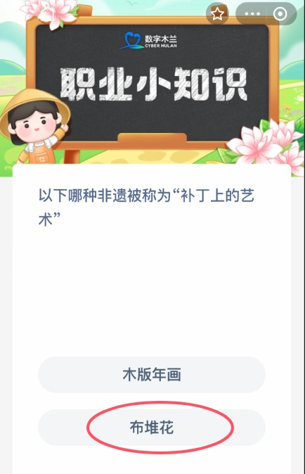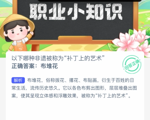 在以下非遗项目中,哪一种被誉为“补丁上的艺术”呢?这是2025年2月18日支付宝蚂蚁新村的题目,今日的正确答案为【布堆花】。布堆花,俗称为拨花、撂花或者布贴画,它通过用各种颜色的布剪出不同图形,然后将这些图形层层堆叠,从而形成图案,呈现出立体感与浮雕效果,也正因如此,它才被称作“补丁上的艺术”。