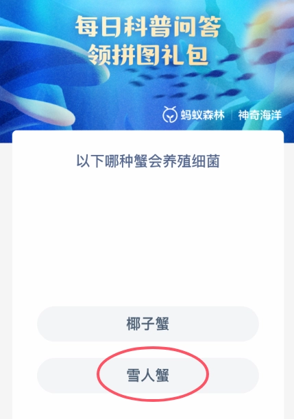 以下哪种蟹会养殖细菌?这就是2025年2月18日蚂蚁森林神奇海洋的答案分享。若想获取更多相关攻略内容,欢迎点击关注爱帮下载,小编会持续为您更新!