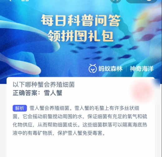 支付宝蚂蚁森林神奇海洋2025年2月18日更新的问题是:以下哪种蟹会养殖细菌?正确答案为【雪人蟹】。雪人蟹会养殖细菌,其毛螯上存在许多丝状细菌,它会通过摇动前螯来搅动周围的水,以此确保细菌能获得充足的氧气和硫化物,助力细菌生长。