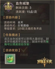 在游戏中,血色副本是我们最先开启的一个副本,深受众多玩家喜爱。这个副本能提供大量经验,每天可进入3次。而且副本评价越高,获取的经验也就越多,因此,在这里我们一定要使用鼓舞来提升伤害。毕竟伤害越高,推关层数就越高,层数越高,不仅经验更多,奖励也会更好!另外还有个小技巧,提升VIP等级能够额外购买更多进入次数,这就是大神等级高的原因所在。像这种经验副本,毫无疑问必须要做到次数拉满。