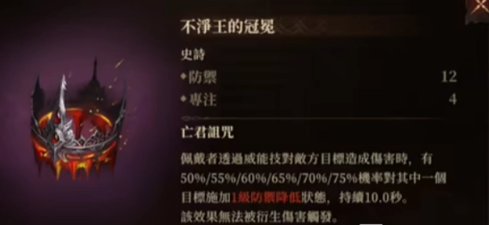 倘若你是热衷于打击对手、制造高额伤害的玩家,那净王的冠冕无疑是你不容错失的神器。它不但能增加12点防御与4点专注,关键在于其特效:佩戴者施展威能技对敌人造成伤害之际,有一定概率使敌人进入防御降低状态,此状态会持续10秒。这表明敌人防御力降低后,你的伤害输出将更为惊人。助力你的威能技精准命中敌人要害,实现更高、更强劲的输出。