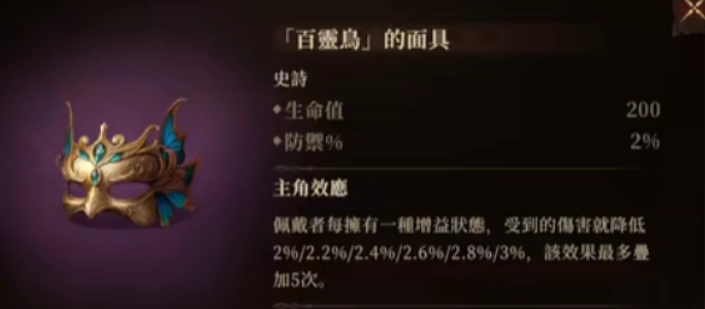 最后,要是你拥有坦克类角色,特别是类似火矮人这般善于给自己添加增益状态的坦克,百灵鸟的面具肯定会给你带来意想不到的惊喜。这件神器能够增加200点生命值以及2%的防御,并且它具备特殊效果:每当佩戴者获取一层增益状态,所承受的伤害就会降低。这无疑是一件极其适合坦克的神器,尤其是针对那些能够自我增益的角色而言,它能大幅提升你坦克的抗压能力,助力你在战斗中保持稳定,不被敌人轻易打败。