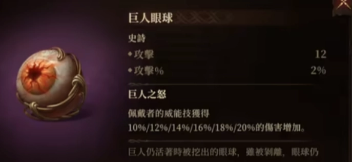 光是听到这款神器的名字,就足以令人心潮澎湃,毕竟“巨人”二字,在众多游戏里,都象征着磅礴的力量。在《龙息神寂》这款游戏中,巨人眼球这一神器,能在你施展威能技的时候,直接增加伤害加成。它不仅能够提升12点攻击力,以及2%的整体攻击,而且在你释放技能之际,还能获取额外的伤害加成,对于物理输出型角色而言,堪称一大福音。要是你的队伍中有负责大范围输出的角色,为他们配备上这款神器,保准敌人会被瞬间秒杀,毫无还手之力。