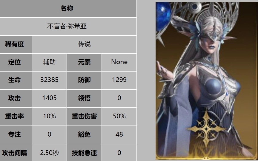 弥希亚作为团队里的治疗核心,具备神圣的治疗本领,能够帮队友回复生命值,稳固团队的生存能力。她的小技能能为单个队友补充大量生命值,在队友生命垂危之际起到关键作用;而大招属于群体治疗,增强团队整体的生存能力。可以说,弥希亚是团队中无可替代的重要角色。
