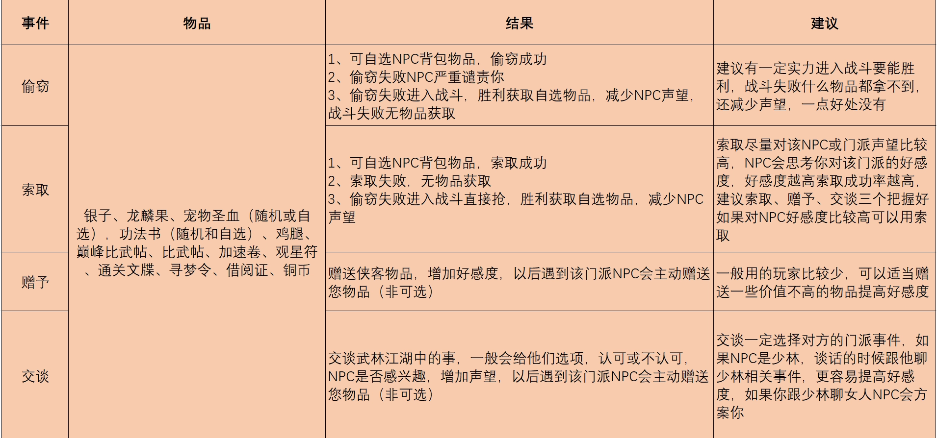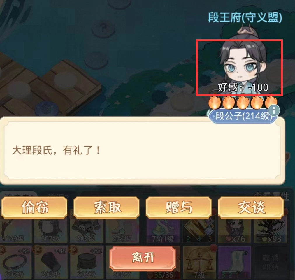 要是你觉得自身实力难以战胜NPC,那就老老实实地通过索取、赠与、交谈等方式,多多提升与对方门派的好感度。