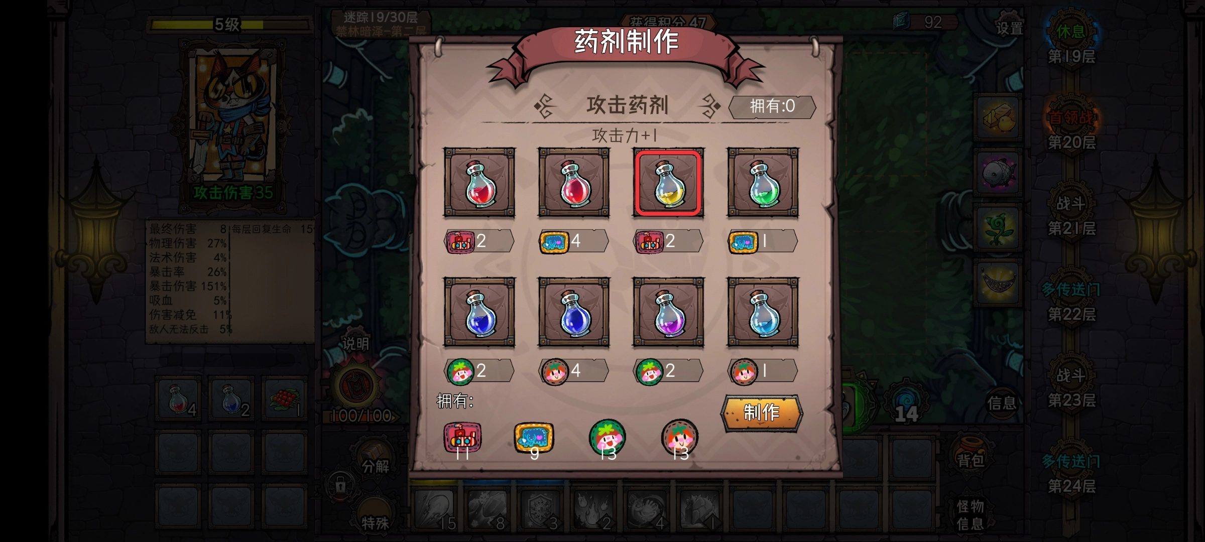药剂方面,红药与蓝药均设有小、中、大三种型号。然而,更为关键的是另外四种属性药,它们分别能够提升攻击、魔力、生命上限以及魔力上限。