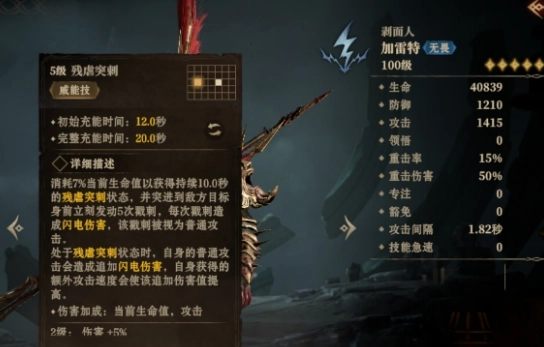 不仅如此,加雷特的战技“戳刺”,能对敌人造成极为可观的闪电伤害,并且该伤害会随着他自身攻击速度的提升而增加,这使得他成为开局战斗中不可或缺的核心人物。每当加雷特成功击杀敌人后,便会迅速进入“残虐突刺”状态,以五连击的凌厉攻势让敌人难以招架。他无疑是既能有效打击敌人,又能出色防守自身的强大存在。