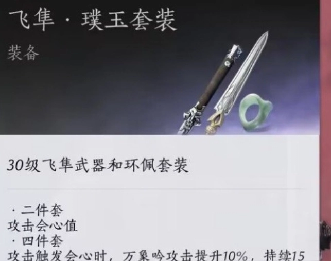 首先推荐飞隼套,它对于剑系流派而言,是极为出色的选择。其效果在整个战斗过程中都能发挥作用,能为剑的输出带来稳定的增益。其次推荐玉斗套搭配易相套,当 BOSS 真气低于 40% 时,玉斗套可触发效果,与易相套四件套配合,能将开盾时间延长 2 秒,还能多发出两道剑气,进而提升输出效果。