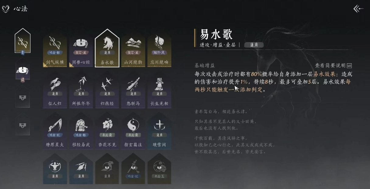 首先,强烈推荐无名心法,它作为无名剑的基础与核心心法,能够显著提升剑相关技能的效果。其次,威猛歌也是不错的选择,它能增强剑客的攻击力,在战斗过程中有效提升输出能力,是极为重要的心法之一。再者,易水歌的心法适配性良好,可提升整体的输出效果。最后,千山法推荐给武器搭配为剑与枪的玩家,该心法具备回复耐力的技能效果。