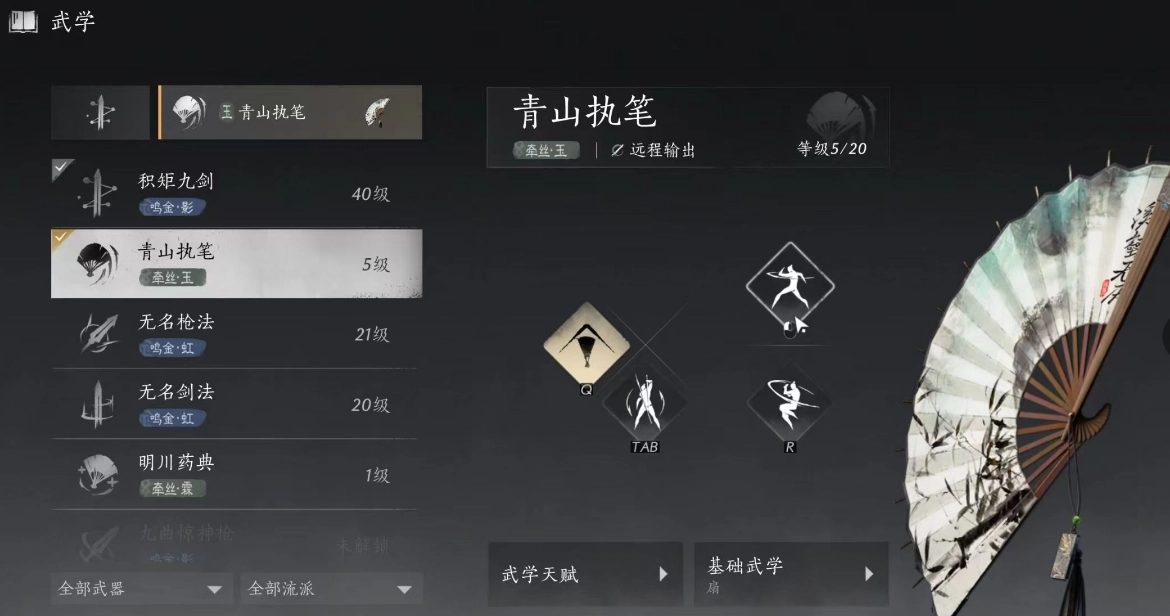 再看第二种搭配:剑与扇子。这种组合特别适合单人探索大世界以及挑战单人副本。扇子具备回血功能,能确保玩家血量始终保持在安全状态,从而在战斗中续航更久。扇子武学方面,可以选择明川药典。