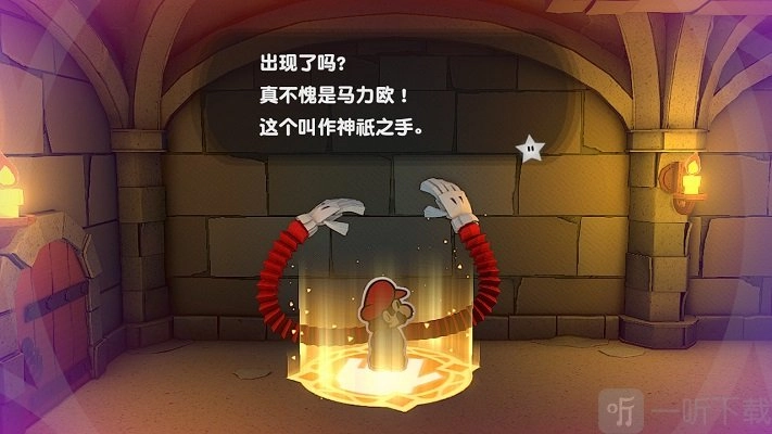 在左侧,有一个魔法阵,通过它能够获取神纸之手。随后,操控JC手柄,从墙壁上“扒拉”下一个名为奥莉维亚的精灵。可还没等把事情解释明白,这精灵就附身到马里奥身上了。