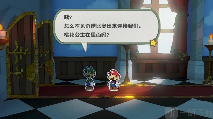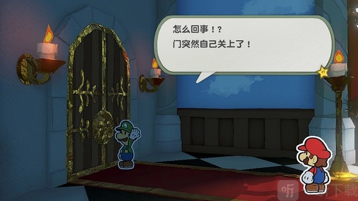 路易吉突然说他把桃花公主的礼物落在车上了,要去拿,准备出去的时候,门却突然关上了。